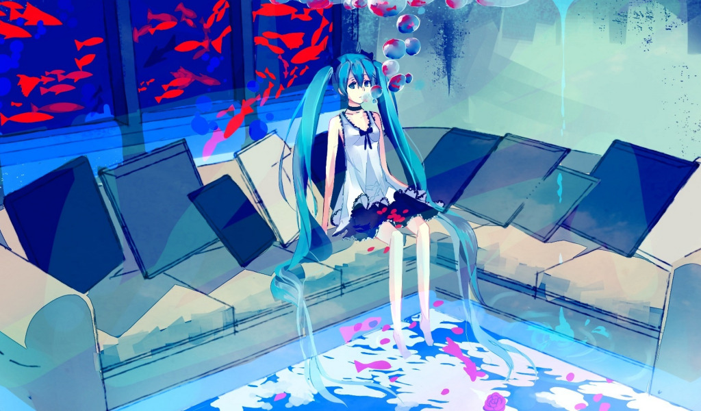 Назад к обои девушка, рыбки, пузыри, диван, подушки, окно, арт, vocaloid