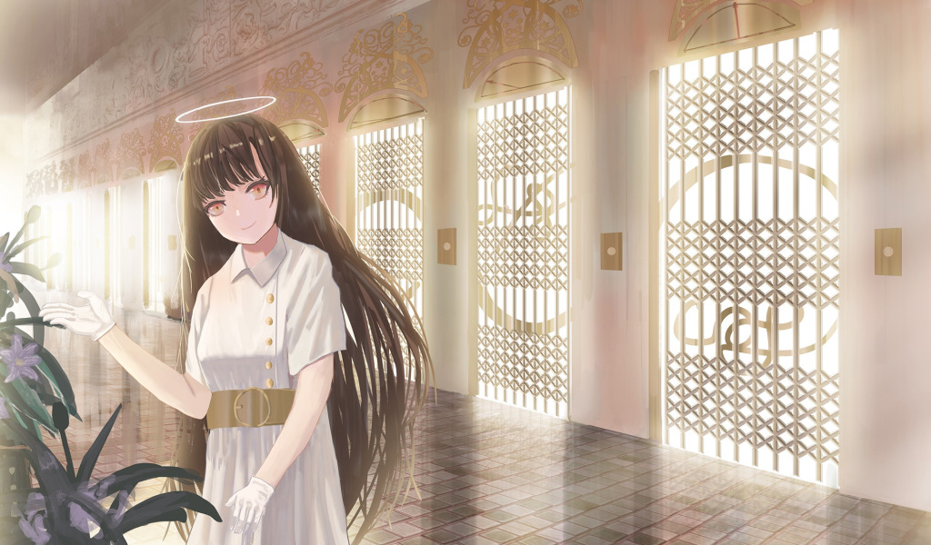 Назад к обои девушка, цветы, коридор, нимб