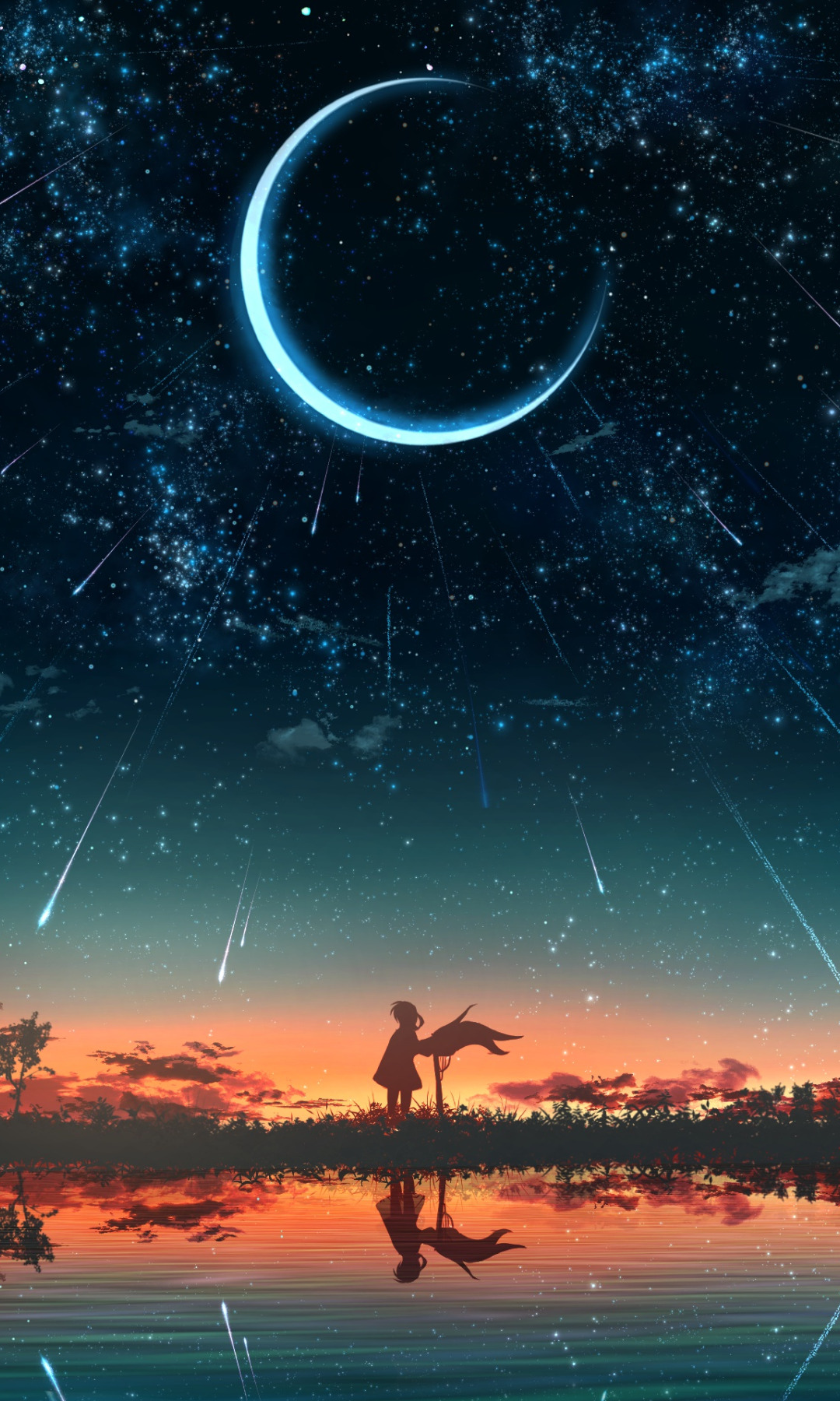 Назад к обои девушка, закат, природа, пруд, фэнтези, полумесяц, звездопад