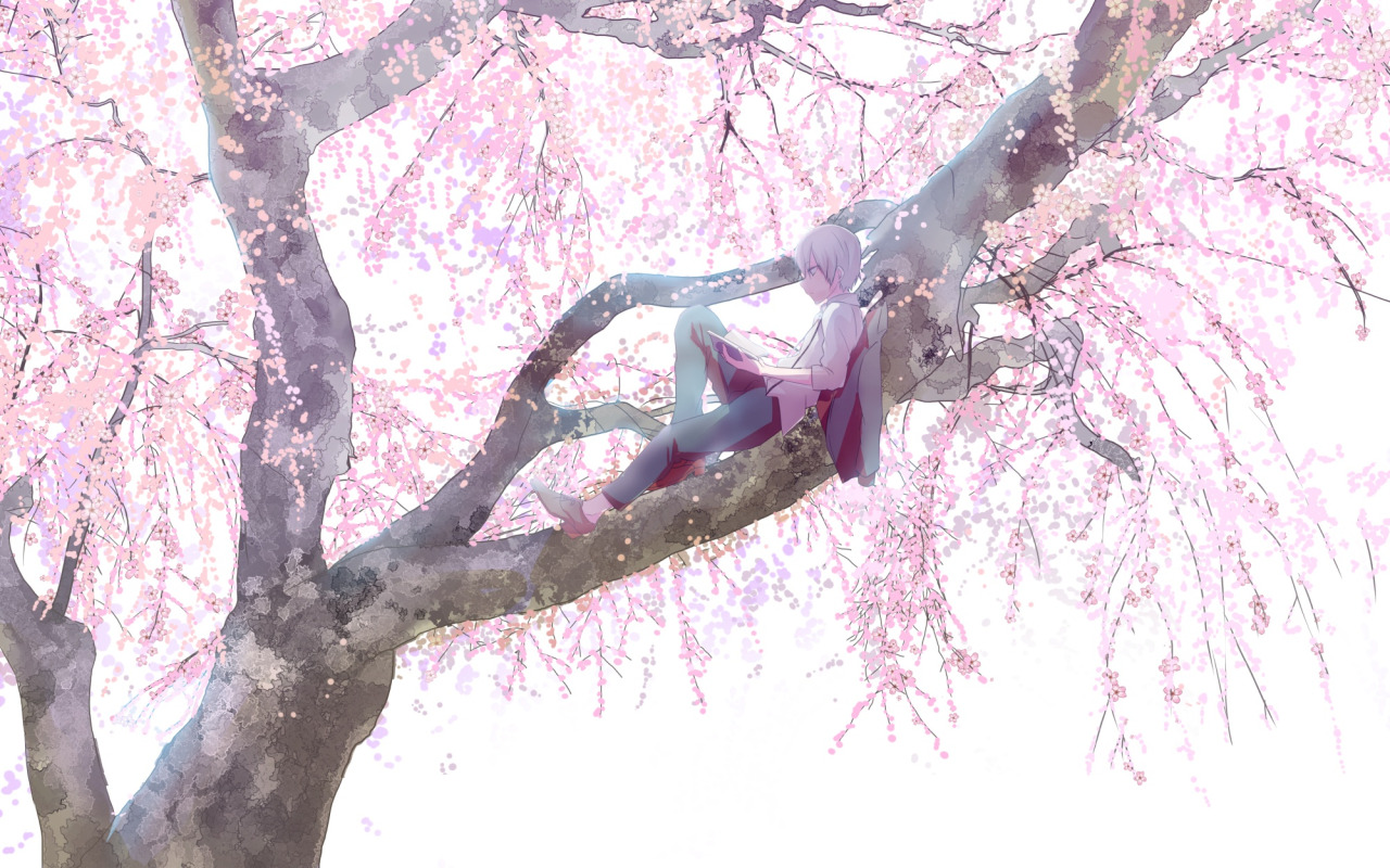 Назад к обои ветки, отдых, весна, мальчик, сакура, цветение, на дереве, большое дерево
