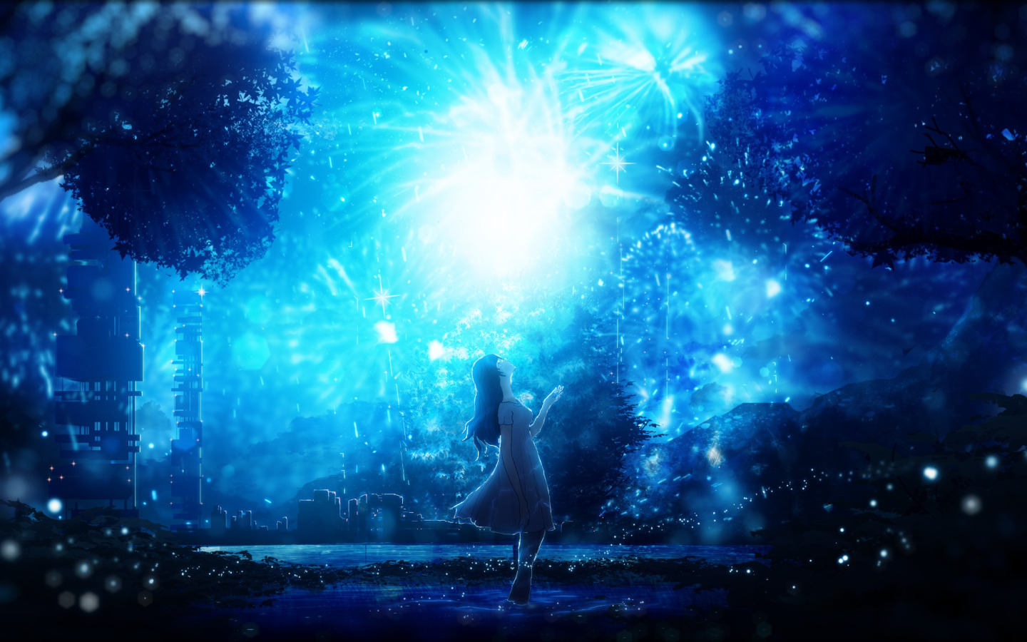 Назад к обои ночь, салют, девочка