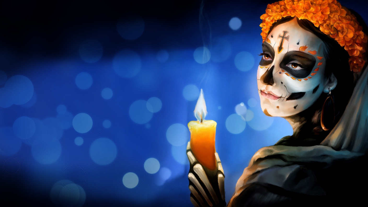 Назад к обои девушка, цветы, стиль, фон, Calavera, Mexico, свечки, dia de los muertos