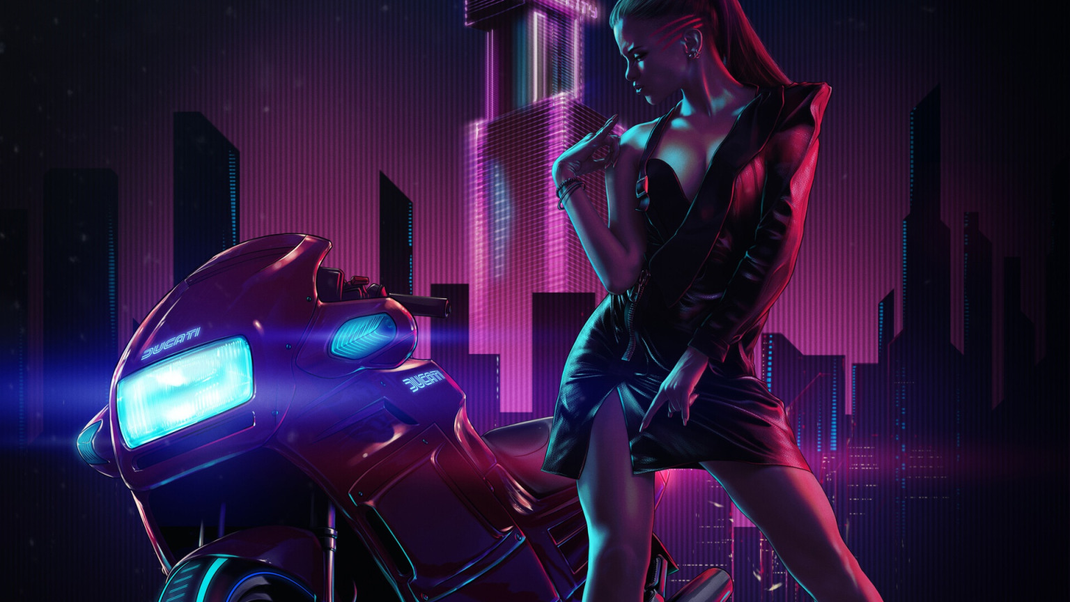 девушка, ночь, стиль, музыка, фантастика, неон, фигура, мотоцикл