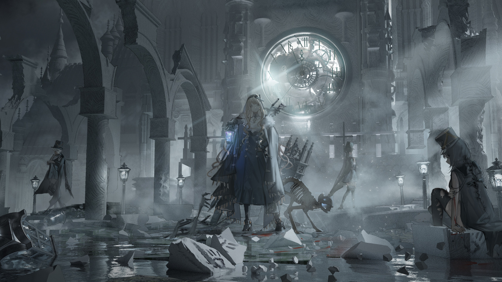 Назад к обои девушка, кровь, часы, скелет, руины