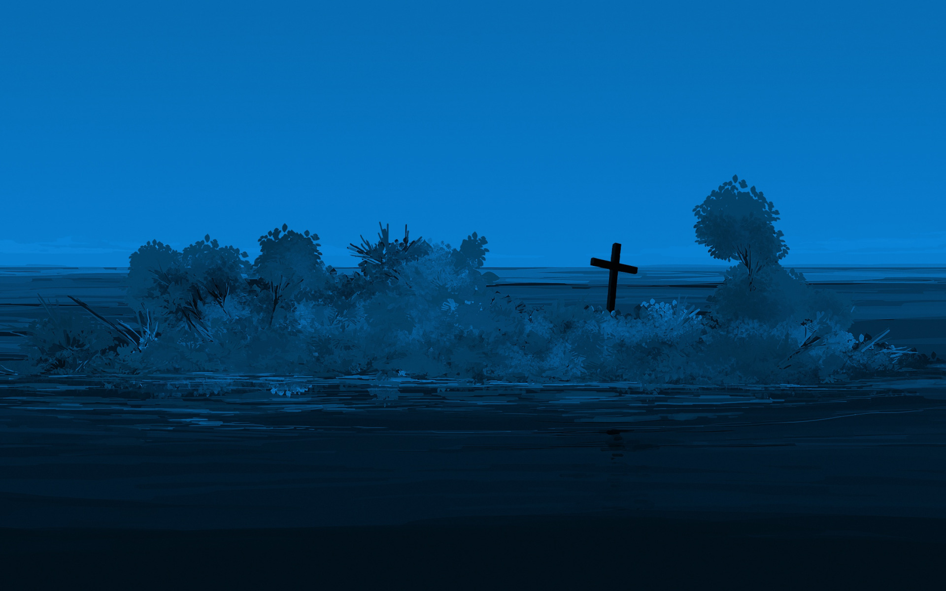 Назад к обои вода, остров, крест, сумерки