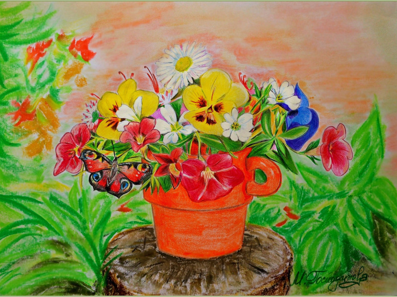 Назад к обои бабочка, рисунок, горшок, цветочки, butterfly, flowers