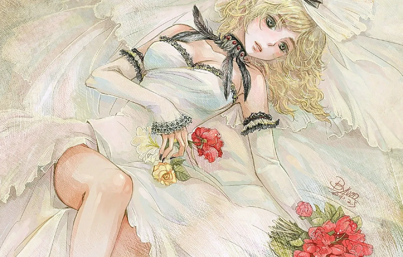 Перья, слезы, декольте, невеста, фата, колени, свадебное платье, лежит на полу обои на телефон (фото, картинки)