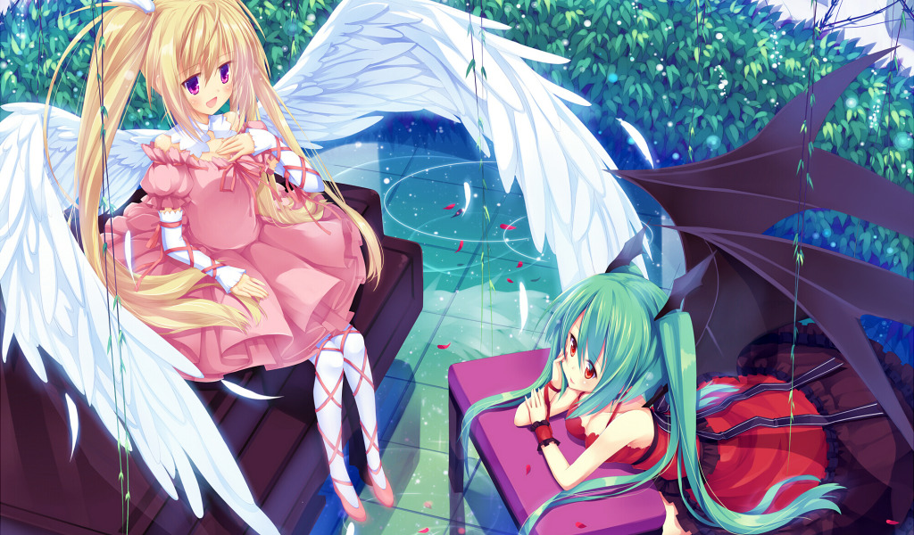 Назад к обои вода, растение, крылья, ангел, перья, демон, две девушки