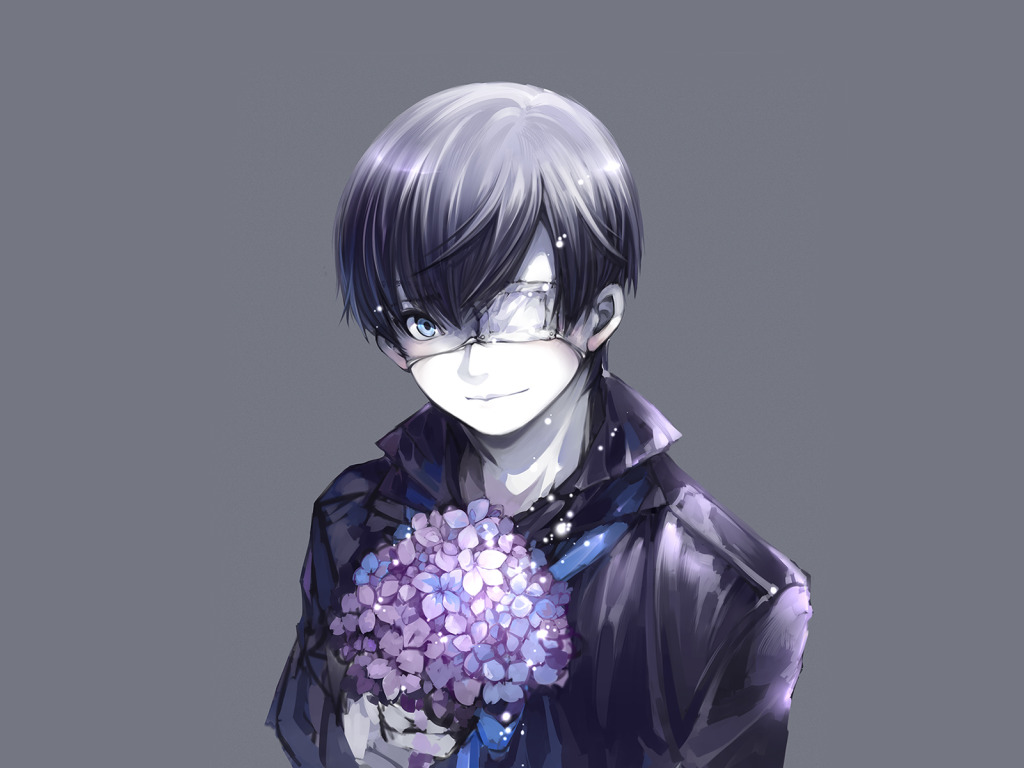 Назад к обои улыбка, букет, повязка, парень, серый фон