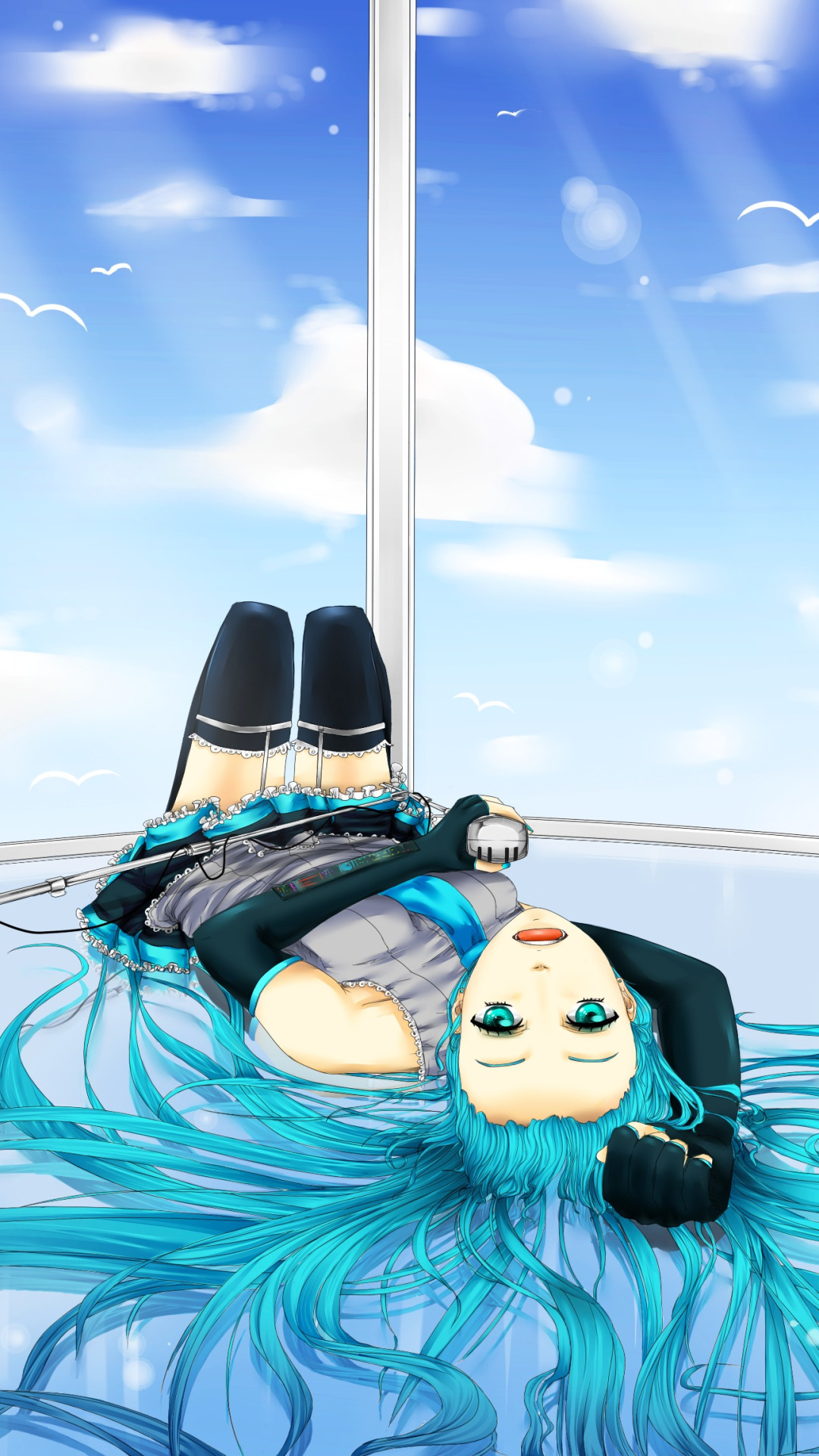 Назад к обои небо, девушка, поза, птица, лежит, микрофон, vocaloid, hatsune miku