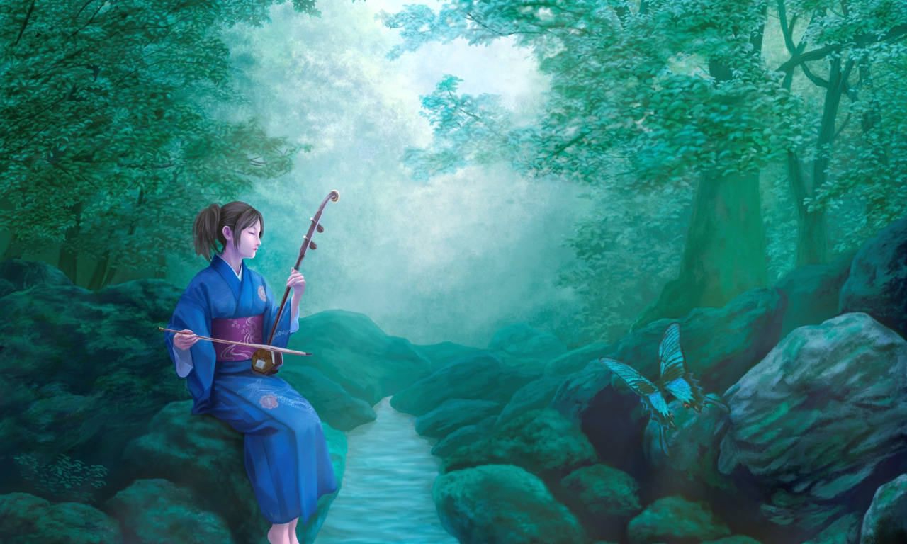 Назад к обои девушка, природа, ручей, бабочка, скрипка, сидит, art, erhu