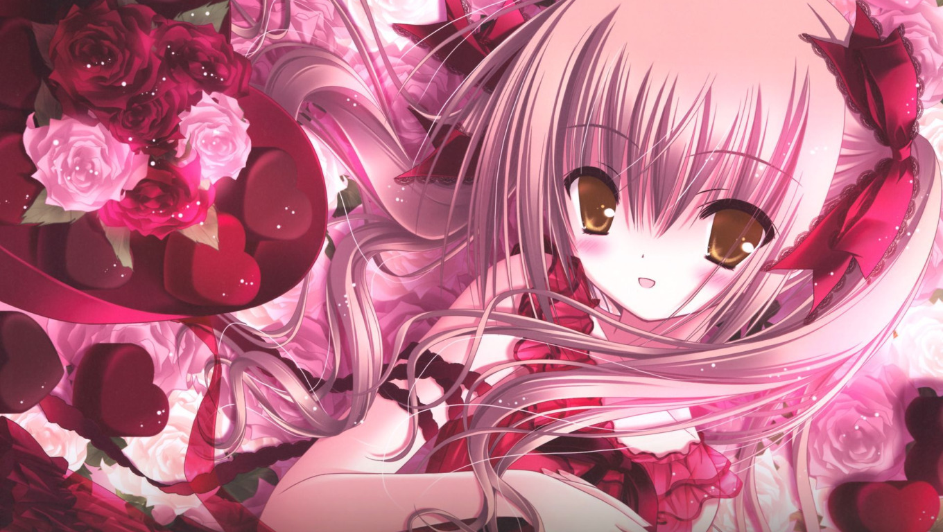 девушка, улыбка, волосы, розы, глазки, аниме, конфеты, бантик