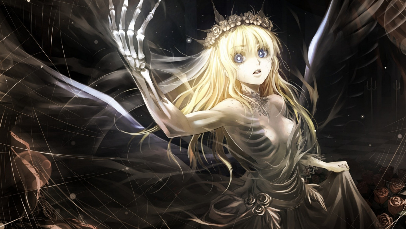Назад к обои девушка, цветы, розы, крылья, аниме, арт, кости, скелет