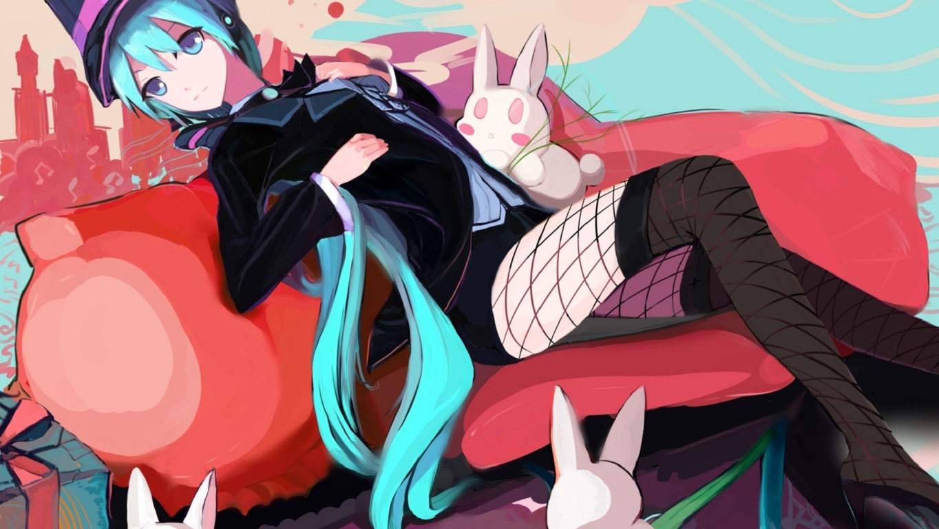 Назад к обои взгляд, девушка, улыбка, краски, кролик, vocaloid, hatsune miku, вокалоид