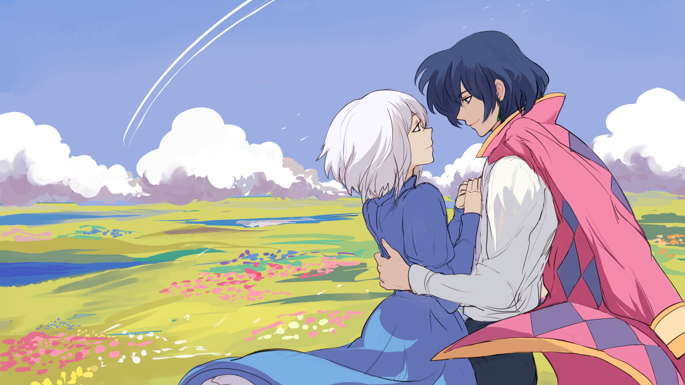 поле, девушка, облака, цветы, арт, парень, Хаяо Миядзаки, Howl's Moving Castle