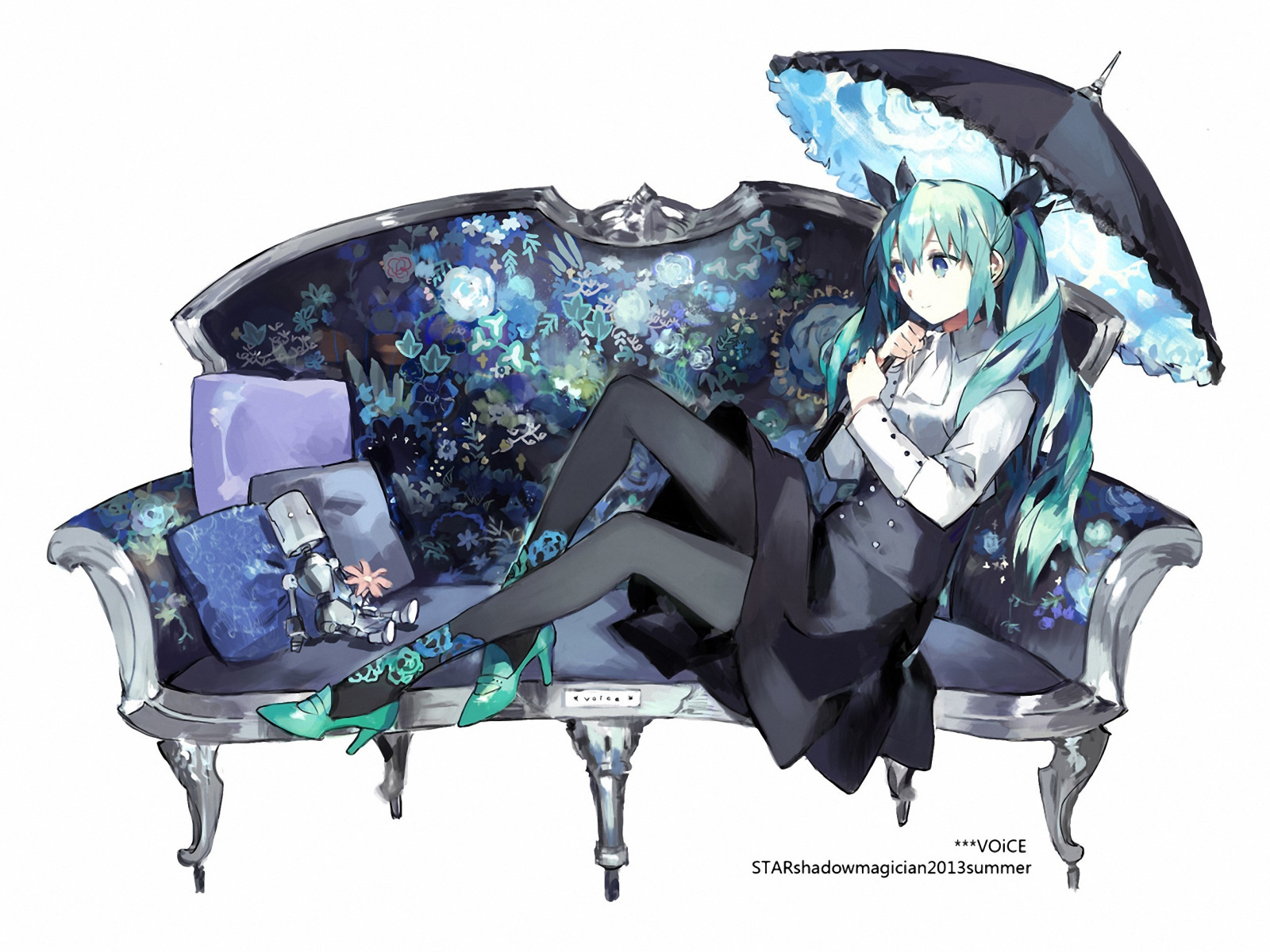 девушка, зонтик, диван, надпись, волосы, робот, юбка, подушки