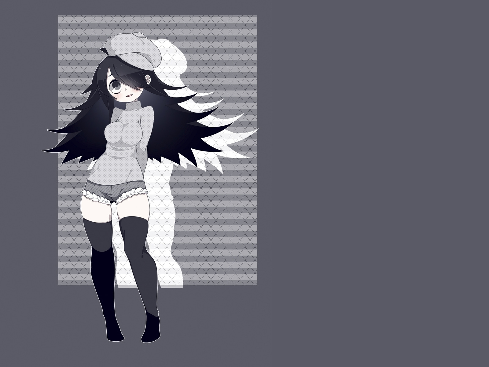 Назад к обои девушка, шорты, удивление, чулки, стоит, серый фон, черные волосы