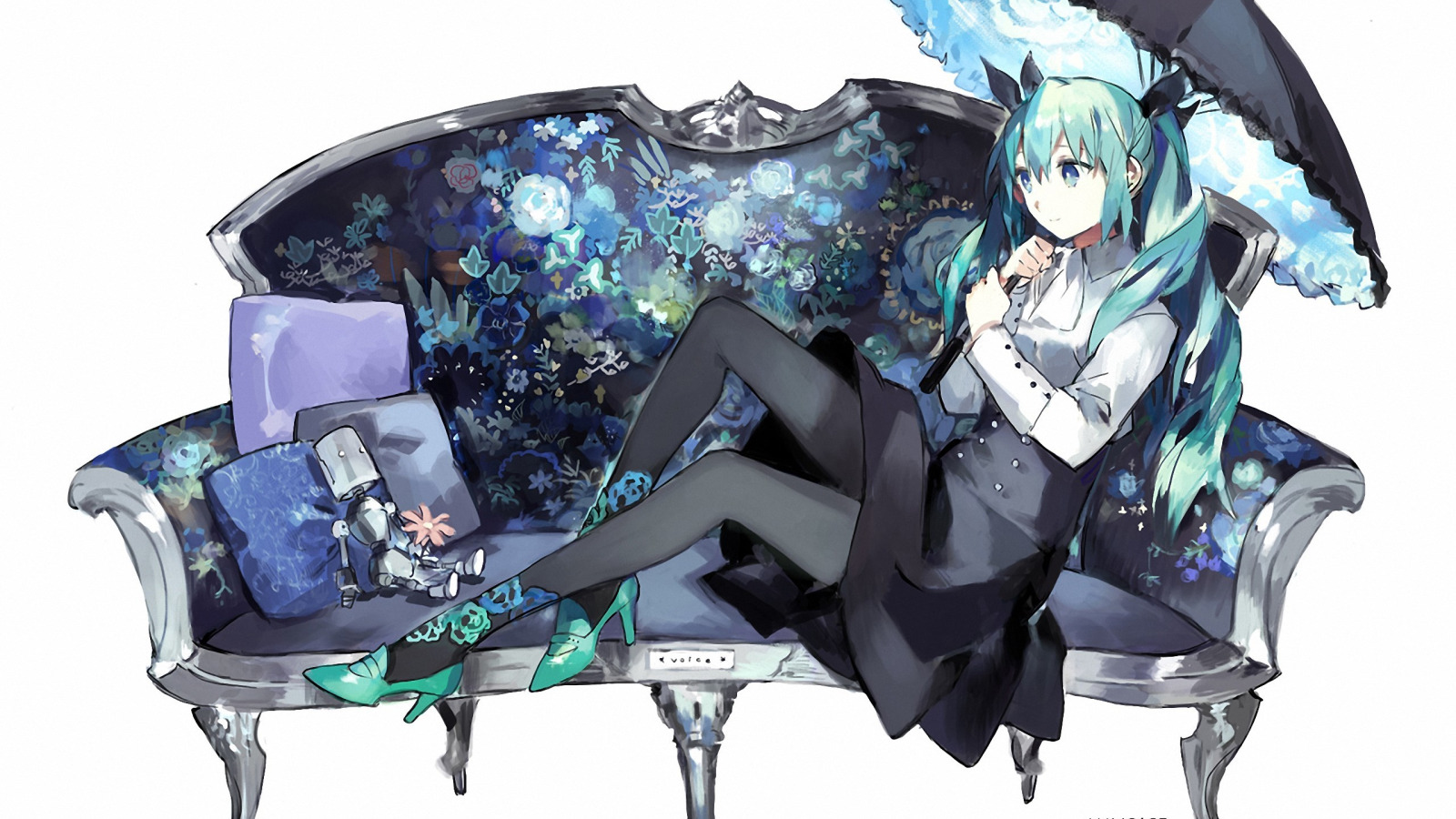 Назад к обои девушка, зонтик, диван, надпись, волосы, робот, юбка, подушки