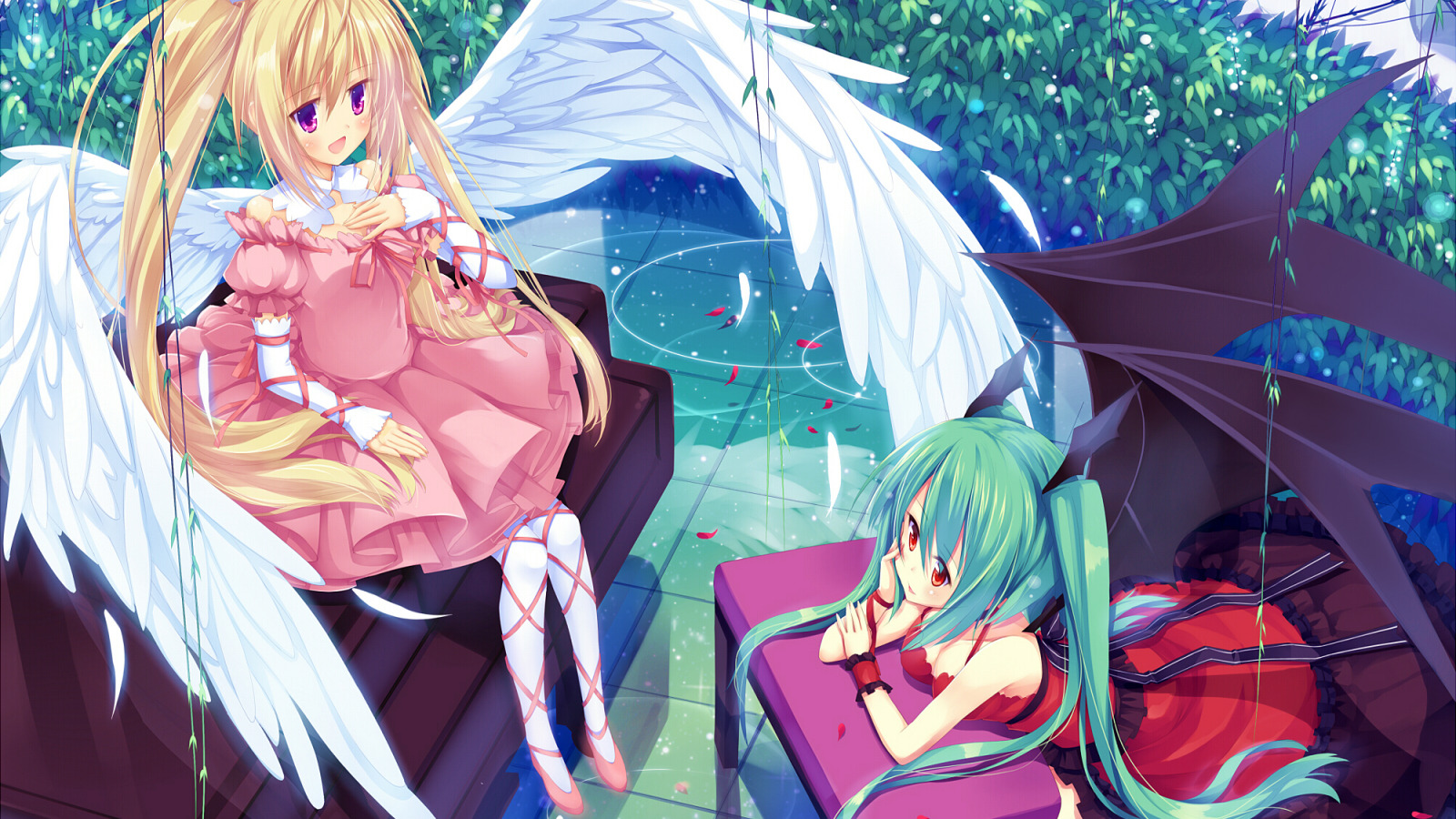 Назад к обои вода, растение, крылья, ангел, перья, демон, две девушки