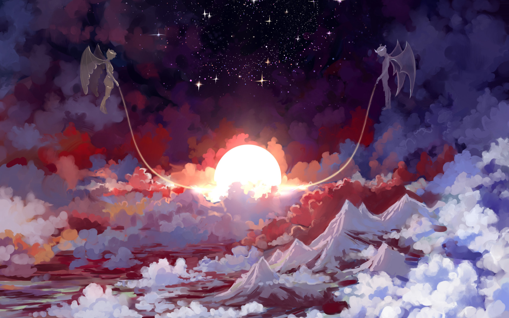 Назад к обои солнце, звезды, облака, горы, ангел, демон, арт