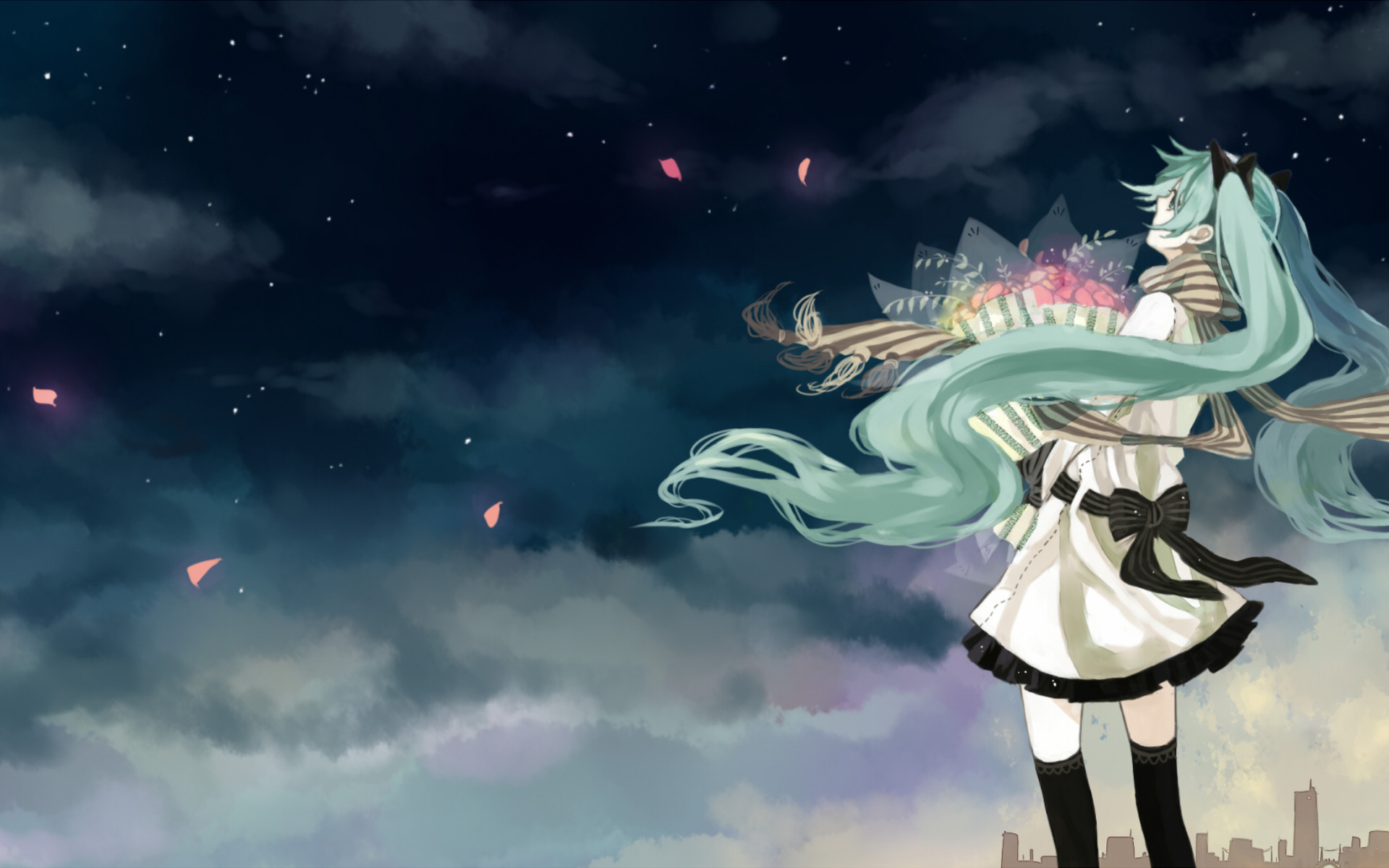 Назад к обои небо, девушка, облака, цветы, ночь, город, дома, букет
