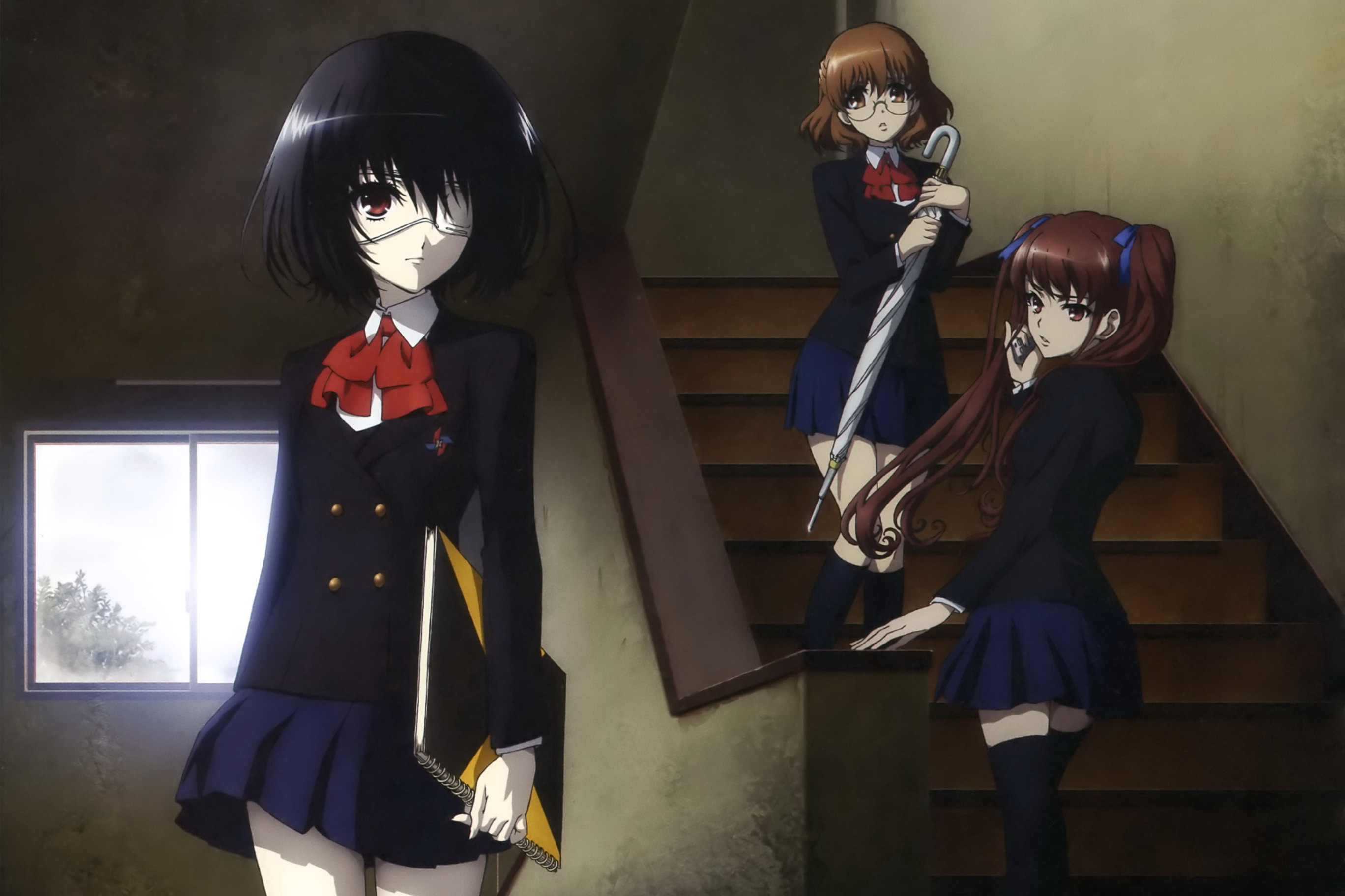 Назад к обои девушка, зонт, аниме, очки, лестница, тетрадь, anime, школьники