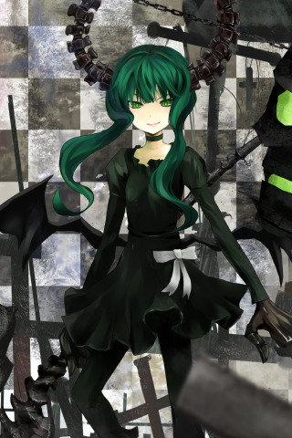 Назад к обои взгляд, девушка, улыбка, череп, крест, цепь, рога, black rock shooter