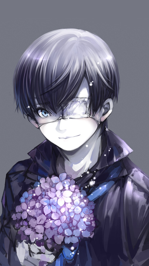 Назад к обои улыбка, букет, повязка, парень, серый фон