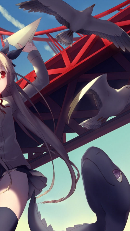 Назад к обои небо, девушка, мост, улыбка, животное, птица, аниме, арт