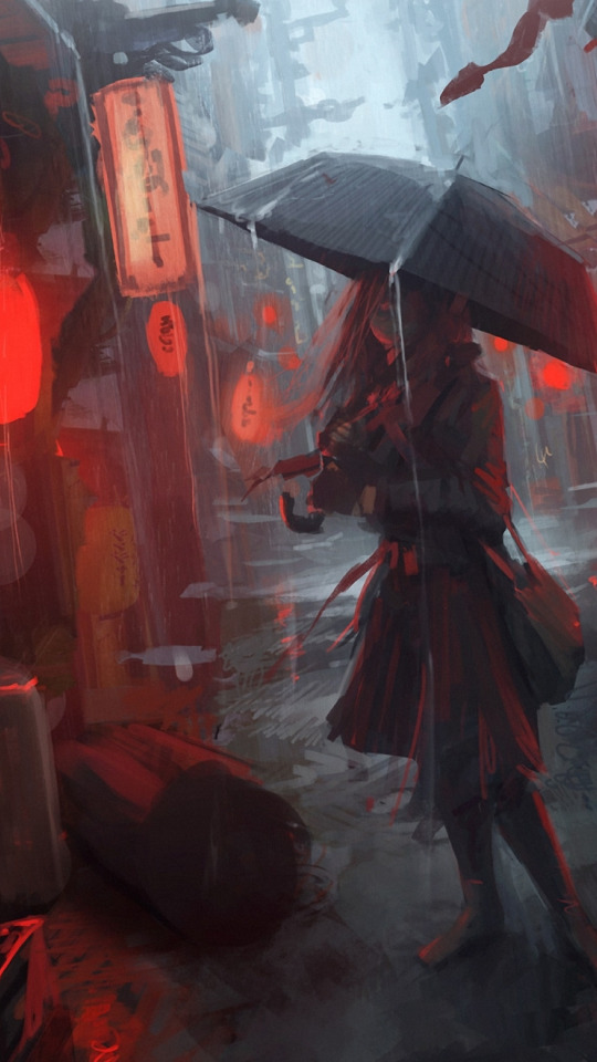 Назад к обои девушка, дождь, улица, зонт, фонари, переулок