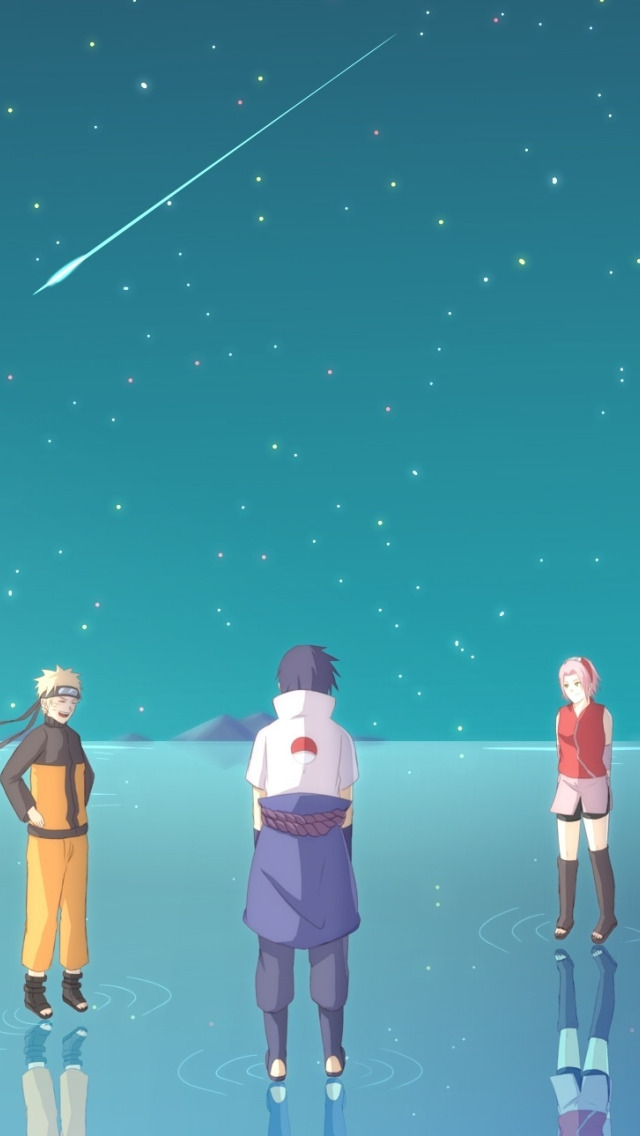 Назад к обои озеро, Sasuke, Naruto, art, sakura, team 7, shinobi, стоят на воде