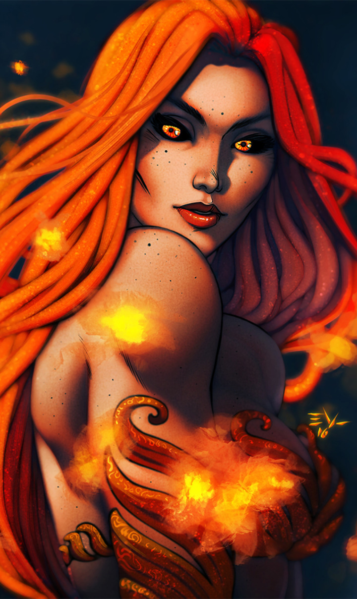 грудь, взгляд, девушка, лицо, огни, красота, арт, рыжая