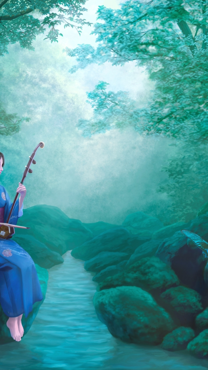 Назад к обои девушка, природа, ручей, бабочка, скрипка, сидит, art, erhu