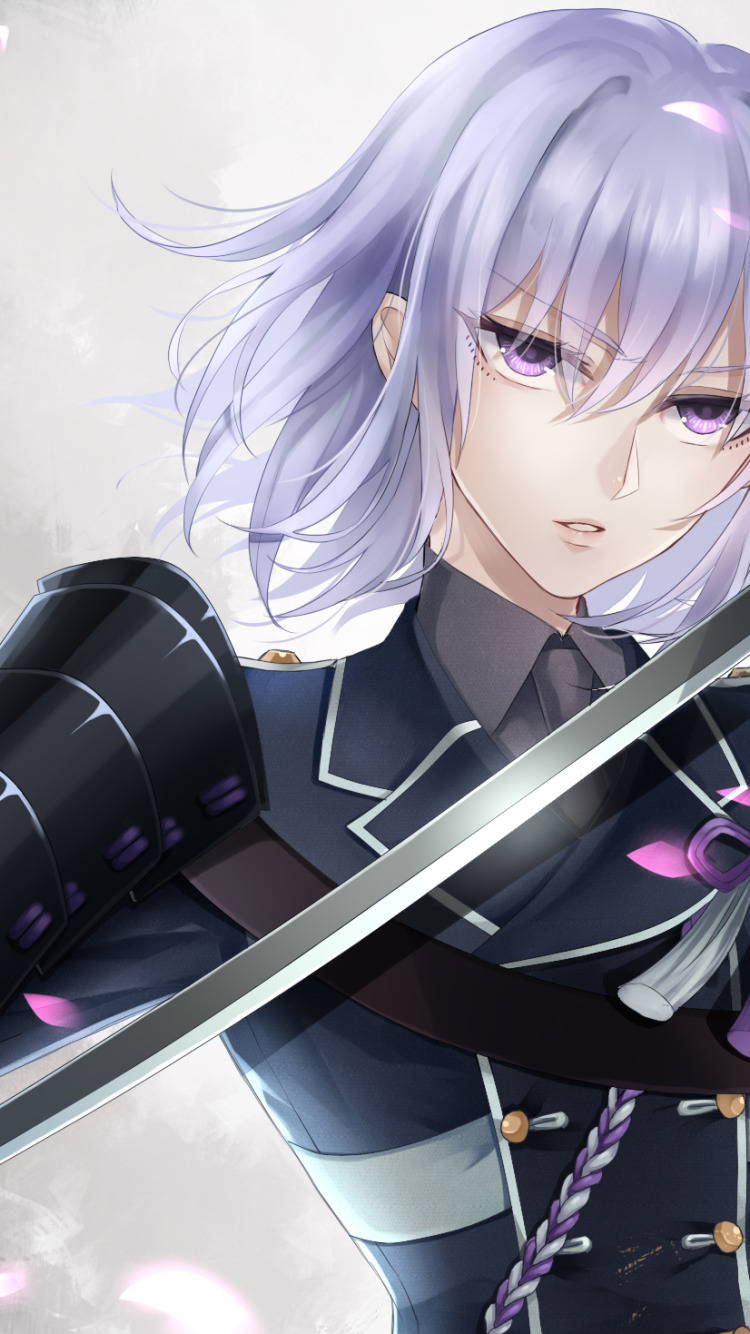 Назад к обои меч, катана, лепестки, форма, парень, сиреневые глаза