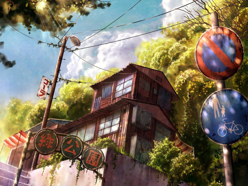 Назад к обои знак, улица, Япония, арт, лестница, навес, домик, старинный