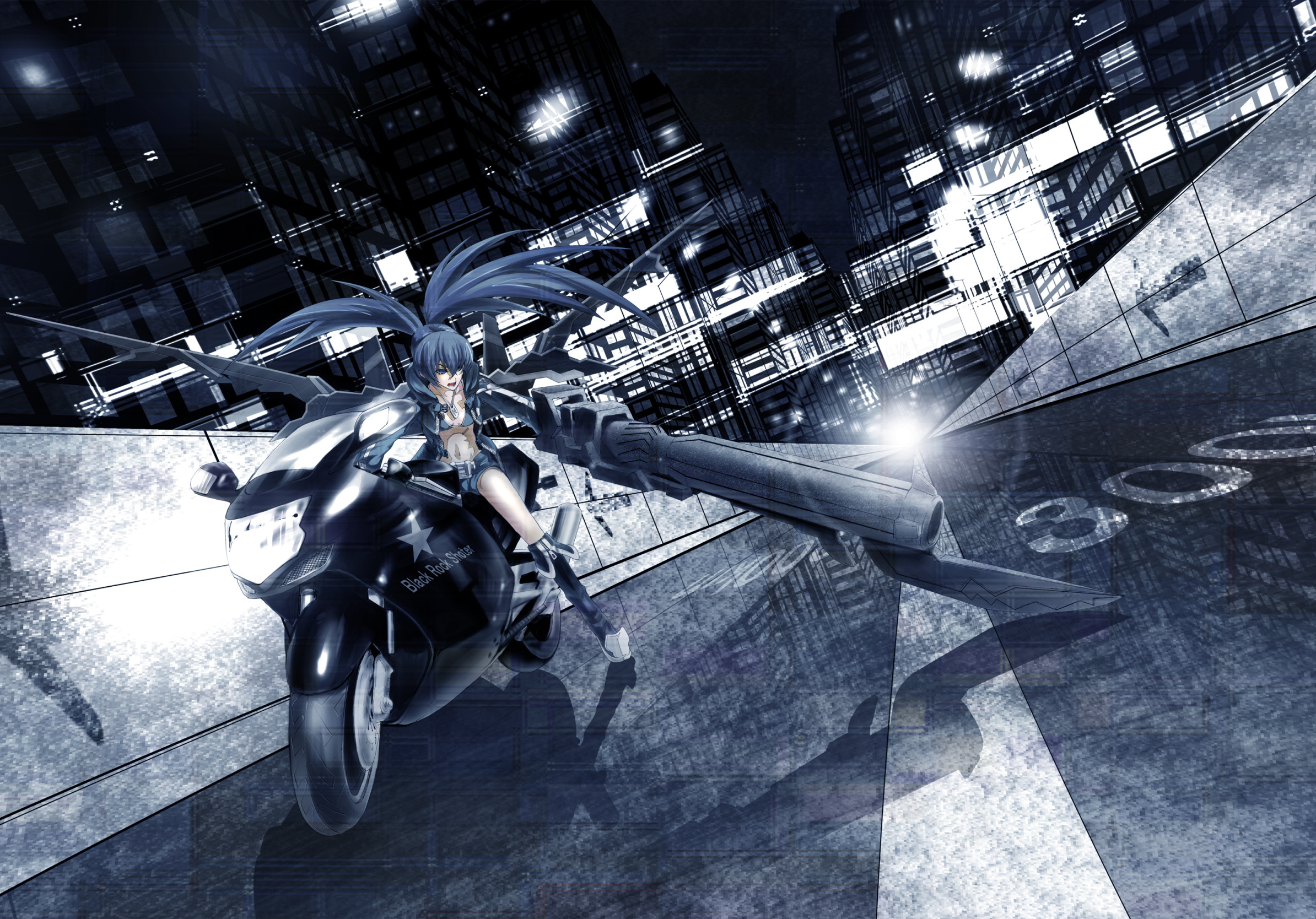 Назад к обои дорога, девушка, свет, город, огни, оружие, дома, аниме