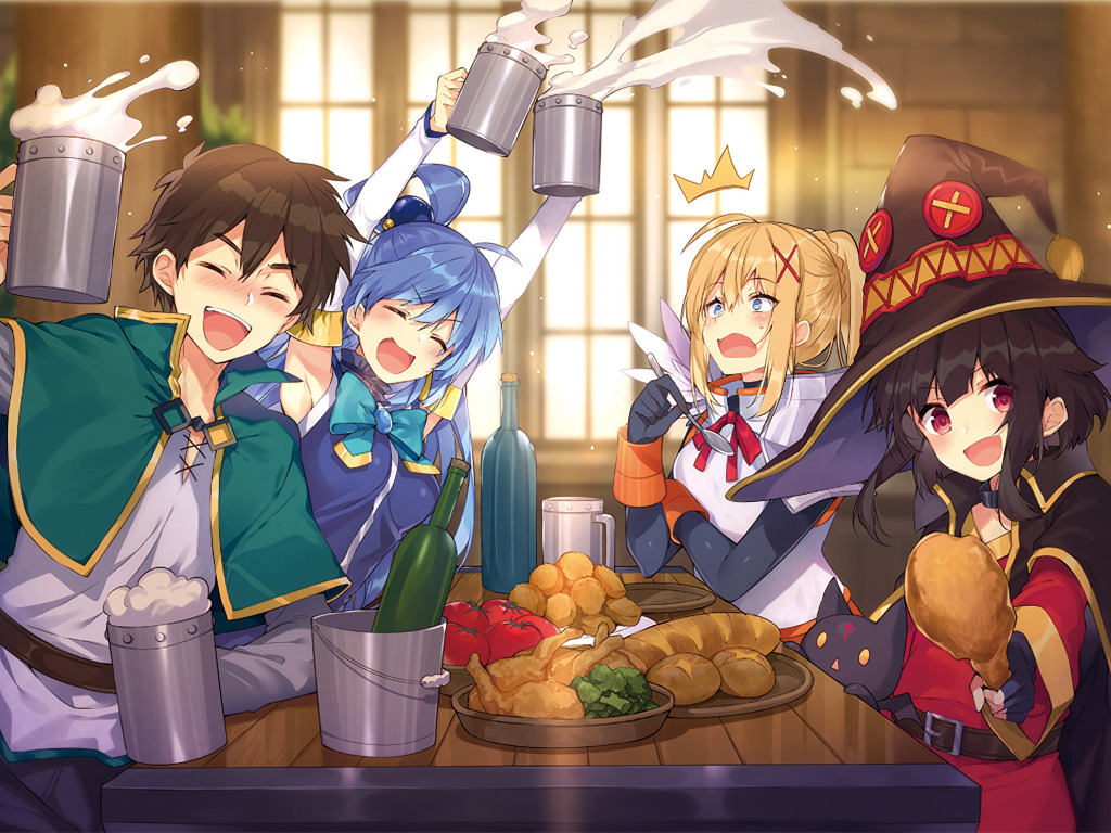 Назад к обои девушка, стол, еда, напиток, парень, Aqua, darkness, Kazuma Satou